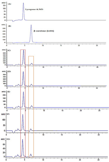 respectively. The limit of detection (LOD) and limit of quantification (LOQ) were in the range of 0.30–10.09 µg/mL, with accuracy of 92–103% presented such that the optimized method was precise, sensitive and reliable to simultaneously identify lycopene and β-carotene in watermelon juice using HPLC (Figure 11) [29,62].