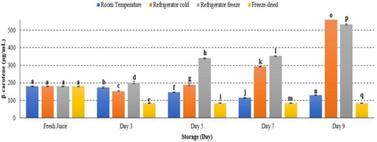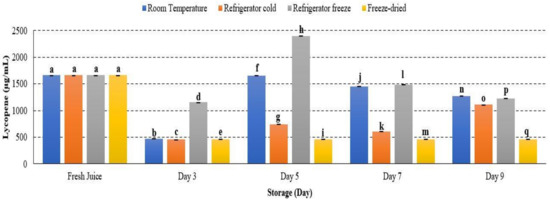 β-carotene concentration increased from day 1 to day 9 of storage at refrigerator cold and refrigerator freeze, while it decreased in room temperature and freeze-dried storage conditions (p < 0.05) (Figure 13). The result indicated that β-carotene retained stability in cold storage [23]. The increment of β-carotene concentration during the ripening process can be induced by ethylene. The production of ethylene was reported prominently in cold storage and subsequently supported the present study [64]. Furthermore, β-carotene is thermolabile-, light- and oxygen-sensitive [65], and decreased β-carotene concentration may possibly indicate the maximal degradation of β-carotene occurrence under room temperature storage [66]. A study further described that high storage temperature may inhibit biosynthesis of carotenoids by limiting the production of ethylene and lead to reduced carotenoid precursor [23]. Hence, the present study demonstrated that the ripening enzyme, ethylene, may affect β-carotene concentration in watermelon juice at different temperature storages.