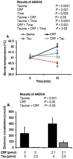 The rectal temperature results were analyzed using a repeated measure three-way analysis of variance (ANOVA), where the main effects were taurine, CRF and time, followed by the Tukey–Kramer test as a post hoc analysis. A two-way ANOVA was carried out for distress vocalizations, behavioral results and amino acids, where the main effects were taurine and CRF, followed by the Tukey–Kramer test as a post hoc analysis when a significant interaction was detected. The differences were considered significant at p < 0.05. The data are presented as means ± standard error of the mean (SEM). The Thompson rejection test was applied to eliminate the experimental data that contained outliers (p < 0.01) [71]. The statistical analysis was performed using StatView version 5.0 (SAS Institute Inc., Cary, NC, USA).