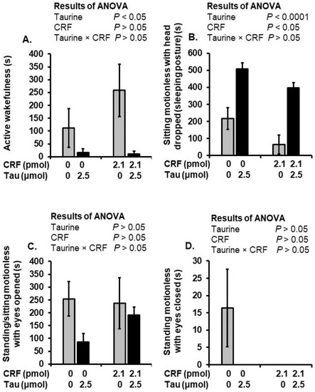 The injection of taurine with or without CRF significantly (p < 0.05) decreased the time spent in active wakefulness compared to the saline- and CRF-injected chicks (Figure 2A). Compared to the CRF- and saline-injected chick groups, taurine significantly (p < 0.0001) increased the time spent in the sleeping posture when injected alone or with CRF. However, CRF significantly (p < 0.05) decreased the time spent in the sleeping posture, regardless of a co-injection with taurine, compared to the saline- and taurine-injected chick groups (Figure 2B). No significant changes were detected in the time spent standing or sitting motionless with the eyes opened or the time spent standing motionless with the eyes closed (Figure 2C,D).