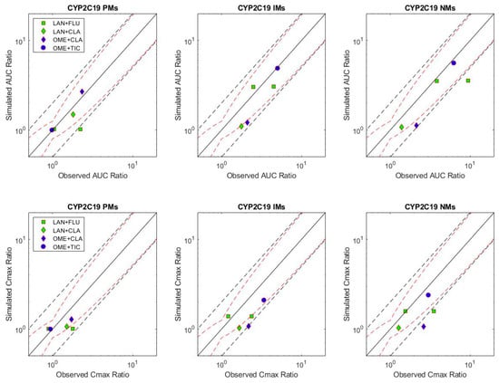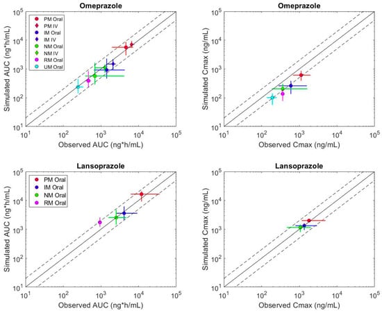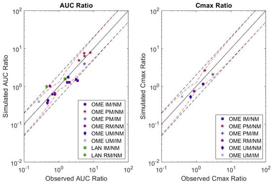 Of the studies compiled, five were selected to evaluate phenotype ratios based on their capturing a range of CYP2C19 phenotypes [18,19,26,33,40]. Approximately 80% of simulated mean AUC and 100% of simulated mean Cmax relative change in exposure between CYP2C19 phenotypes were within the Guest et al. [58] acceptance criteria (Figure 3).