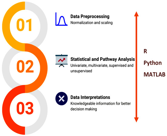 Each tool has strengths and weaknesses and should not come from using one over the other. Due to the complexity of metabolomics data, it is essential to regard the outcomes from the secondary analysis with caution. For example, enrichment analysis can generate significant pathway hits from only one or two metabolites in a pathway. As such, precise scrutinization and logical biological interpretation of the data should be undertaken. With this in mind, metabolomics scientists should incorporate secondary analysis into their analyses, as these beneficial outcomes can be attained rapidly [73]. The secondary analysis field is coming into its own, and its steady growth will help enhance the success of the metabolomics approach. These cutting-edge bioinformatics analysis tools that are completely incorporated with various functions and are accessible and manageable by users who lack prior knowledge in programming are vital in metabolomics research. They will persist in enabling discoveries and more significant insights for increasing metabolomics research.