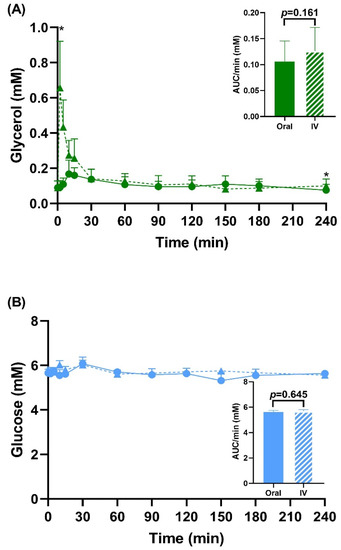The following supporting information can be downloaded at: https://www.mdpi.com/article/10.3390/metabo12100890/s1, Figure S1. 13C-enrichment data of glucose (blue) and lactate (red) after oral (A) and intravenous (B) 13C3-glycerol administration. Inset graphs with the area under the curve (AUC) data. * p < 0.05 via paired t-test or Wilcoxon sign-rank test between oral and intravenous administration. n = 8.