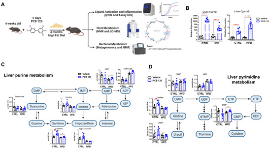 Effects of early life PCB 126 on AHR signaling and liver nucleotide metabolism in mice with CTRL or HFD. (A) Experimental schematic for determining the interaction between diet and early life PCB 126 exposure. (B) qPCR analysis of mRNA levels of AHR targeted genes in the liver from CTRL or HFD-fed mice with vehicle or PCB 126 exposure. (C,D) 1H NMR analysis of liver purines (C) and pyrimidines (D) from CTRL or HFD-fed mice with vehicle or PCB 126 exposure. Values are means ± S.D. (n = 6 per group). * p < 0.05, ** p < 0.01, **** p < 0.0001 compared to vehicle. AMP, adenosine monophosphate; ADP, adenosine diphosphate; ATP, adenosine triphosphate; CDP, cytidine 5′-diphosphate; CMP, cytidine 5′-monophosphate; CTP, cytidine 5′-triphosphate; GMP, guanosine monophosphate; IMP, inosine monophosphate; UMP, uridine monophosphate; UDP, uridine 5′-diphosphate; UTP, uridine 5′-triphosphate.