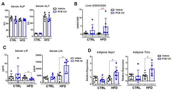 Effects of early life PCB 126 on inflammatory indicators in mice with CTRL or HFD. (A) Serum concentrations of alanine transaminase (ALT) and alkaline phosphatase (ALP) from CTRL or HFD-fed mice with vehicle or PCB 126 exposure. (B) Ratio of oxidized glutathione (GSSG) to reduced glutathione (GSH) in the liver from CTRL or HFD-fed mice with vehicle or PCB 126 exposure. (C) Serum cytokines, including leukemia inhibitory factor (LIF) and lipopolysaccharide-induced CXC chemokine (LIX), from CTRL or HFD-fed mice with vehicle or PCB 126 exposure. (D) qPCR analysis of mRNA levels of inflammatory cytokines in the adipose from CTRL or HFD-fed mice with vehicle or PCB 126 exposure. Values are means ± S.D. (n = 6 per group). * p < 0.05, ** p < 0.01 compared to vehicle.