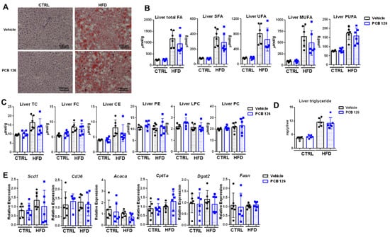 Effects of early life PCB 126 on liver lipid metabolism in mice with CTRL or HFD. (A) Oil Red O staining in the liver of CTRL or HFD-fed mice with vehicle or PCB 126 exposure. (B,C) Quantitative 1H NMR analysis of liver fatty acid (B) and lipid (C) profiling from CTRL or HFD-fed mice with vehicle or PCB 126 exposure. (D) Liver triglyceride levels from CTRL or HFD-fed mice with vehicle or PCB 126 exposure. (E) qPCR analysis of mRNA encoding de novo fatty acid biosynthesis in liver from CTRL or HFD-fed mice with vehicle or PCB 126 exposure. Values are means ± S.D. (n = 6 per group). TC, total cholesterol; FC, free cholesterol; CE, cholesterol ester; PE, phosphatidylethanolamine; LPC, lysophosphatidylcholine; PC, phosphatidylcholine; FA, fatty acid; SFA, saturated fatty acid; UFA, unsaturated fatty acid; MUFA, monosaturated fatty acid; PUFA, polyunsaturated fatty acid.