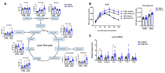 POPs have recently been linked with the development of type 2 diabetes and other metabolic diseases [33]. Quantitative 1H NMR analysis revealed that early life PCB 126 exposure resulted in significantly higher levels of metabolites involved in the tricarboxylic acid (TCA) cycle, including pyruvate, aspartate, fumarate, succinate, citric acid, glutamate, and α-ketoglutarate, in the liver from HFD-fed mice in adulthood (Figure 4A). Notably, the glucose tolerance test showed impaired glucose tolerance in HFD-fed mice later in life with early life PCB 126 exposure (Figure 4B). No significant changes were observed in metabolites involved in the TCA cycle or glucose tolerance test in CTRL-fed mice with early life PCB 126 exposure (Figure 4A,B). The mRNA expression of genes involved in gluconeogenesis was also significantly higher in the liver of HFD-fed mice with early life PCB 126 exposure (Figure 4C). Together, these results indicated that early life exposure to PCB 126 aggravates impaired glucose homeostasis in HFD-fed mice in adulthood.