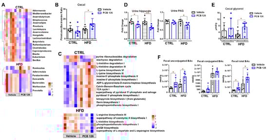 Effects of early life PCB 126 on bacteria community and metabolism in mice with CTRL or HFD. (A) Heatmap representation of the abundance of cecal bacteria from genera that were significantly changed from CTRL or HFD-fed mice with vehicle or PCB 126 exposure. (B) Ratio of Firmicutes to Bacteroidetes in cecal contents from CTRL or HFD-fed mice with vehicle or PCB 126 exposure. (C) Analysis of KEGG pathway abundance that significantly changed in the cecal microbiota from CTRL or HFD-fed mice with vehicle or PCB 126 exposure. (D) 1H NMR analysis of urine hippurate and phenylacetylglycine (PAG) from CTRL or HFD-fed mice with vehicle or PCB 126 exposure. (E) 1H NMR analysis of cecal glycerol from CTRL or HFD-fed mice with vehicle or PCB 126 exposure. (F) Quantitative UPLC-MS analysis of bile acids in the feces from CTRL or HFD-fed mice with vehicle or PCB 126 exposure. Values are means ± S.D. (n = 6 per group). * p < 0.05, ** p < 0.01 compared to vehicle.