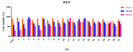 The effect of 21 compounds on 6 tumor cell lines (A–F) treated with 10, 20 and 40 μM for 48 h. Percent cell viability was expressed as mean ± SD. * p < 0.05, ** p < 0.01, *** p < 0.001, **** p < 0.0001, in comparison to control groups.