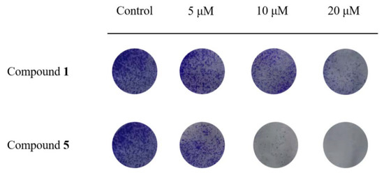 In cell cloning assays, as in Figure 5, both compounds 1 and 5 inhibited the formation of RKO cell clones and showed a dose-dependent effect. Compounds 1 and 5 inhibited the size and number of RKO cell clones when given at 5 μM, and the inhibition was particularly pronounced at 20 μM, with only some of the smaller clones or almost no clones present.