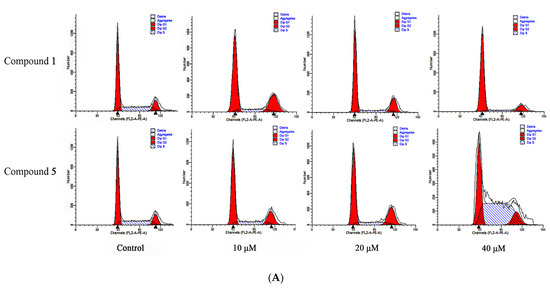 The effects of compounds 1 and 5 on the RKO cell cycle. (A) Cells were processed with 10, 20 and 40 μM for 48 h, respectively, collected, then stained with PI and analyzed by flow cytometry and the results were processed with Modfit LT 5.0; (B) statistics of RKO cell cycle results.