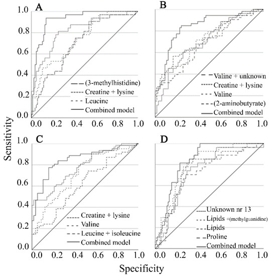AUC for soybean consumption was improved using combined metabolites (valine and asparagine). For citrus fruits and marmalade as well as for nuts and almonds, combined metabolites (all unidentified) only marginally improved the model (Table 2); note that unidentified variables may originate from the same metabolite. The predictive ability of consumption of meat products/processed meat and poultry consumption increased when combining metabolites (creatinine, creatine + lysine, and valine). For red meat consumption, the combined metabolite model (3-methylhistidine, leucine, and creatine + lysine) improved the AUC (92%) compared to each separate metabolite (70–82%) (Figure 1A).