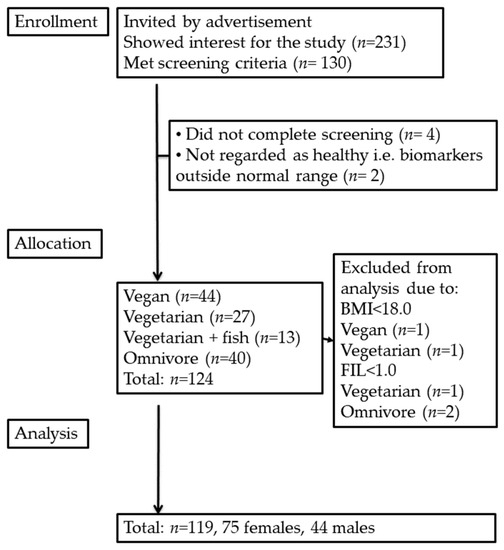 The current work was based on data from a cross-sectional metabolomics study which included 124 healthy subjects living in the Gothenburg area, Sweden, registered at Clinicaltrials.gov as NCT02039609. Recruitment, study design, subject characteristics, and dietary intake have been described in detail elsewhere [31,32]. Briefly, healthy females and males complying with self-reported habitual vegan, (lacto-/ovo-) vegetarian, vegetarian adding fish, or omnivore diets were recruited during 2013 and 2015. Inclusion criteria were age between 18 and 65 y, no regular use of medications, and having a BMI between 18 and 30 kg/m2. Subjects who were pregnant, lactating, or used nicotine products regularly were excluded. Subjects were not allowed to drink alcohol the night before or to consume diet supplements one week before sampling.