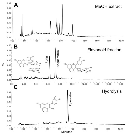 - Lapa, F.D.R.; Gadotti, V.M.; Missau, F.C.; Pizzolatti, M.G.; Marques, M.C.A.; Dafré, A.L.; Farina, M.; Rodrigues, A.L.S.; Santos, A.R.S. Antinociceptive properties of the hydroalcoholic extract and the flavonoid rutin obtained from Polygala paniculata L. in mice. Basic Clin. Pharmacol. Toxicol. 2009, 104, 306–315. [Google Scholar] [CrossRef] [PubMed]