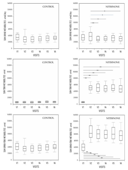 The SUM URINE metabolites were similar across visits V1 to V6 in the control group. In the NIT group, the SUM URINE metabolites were significantly higher at V2 compared with subsequent visits (Figure 1). The SUM TBW metabolites were similar across visits V1 to V6 in the control group. In the NIT group, the SUM TBW metabolites were significantly lower at V1 compared with all subsequent visits (Figure 1).