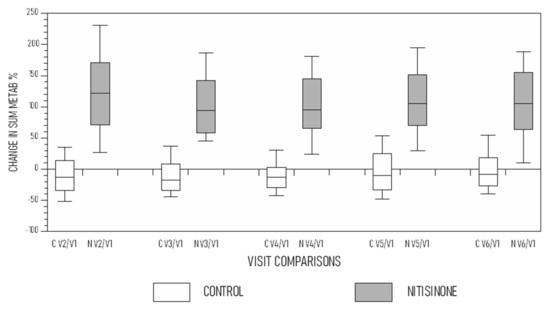 The change in SUM METAB (%) was noted from visit V2 onward compared with V1. For example, comparing visit V2 with V1, the calculation shown in brackets [(V2−V1/V1) × 100] was mostly negative in the control group (Figure 2), and similar calculations were made comparing V3, V4, V5 and V6 against V1. In the NIT group, the change in SUM METAB noted from visit V2–V6 onward compared with V1 [(V2−V1/V1) × 100] was consistently around 100% (Figure 2).