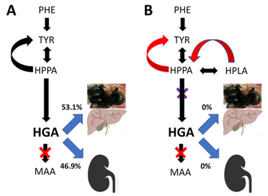 Diagrammatic representation showing that HGA accumulates in AKU due to a deficiency of homogentisate dioxygenase (denoted by the red X), with a measured spill-over into urine as well as predicted biliary excretion and accumulation in the body as pigment. In AKU (Panel (A)), circulating HGA is in low concentration relative to urinary excretion and therefore the urinary excretion is dominant. However, data during nitisinone (reflecting 4-hydroxyphenylpyruvate dioxygenase inhibition denoted by the purple) show that 53.1% of TYR flows into the non-urinary pathways including biliary and pigment pathway and only 46.9% is excreted in the urine, following 10 mg nitisinone daily for 4 weeks. Panel (B) shows the complete inhibition of HGA urinary and biliary excretion as well as HGA deposition and the suggested mechanism for metabolite generation during nitisinone treatment. (PA: phenylalanine; TYR: tyrosine; HPPA: 4-hydroxyphenylpyruvate; HPLA: 4-hydroxyphenyllactate; HGA: homogentisic acid; MAA: maleylacetoacetic acid) (Image of pigmented elbow joint denotes the total body ochronotic process; that of the liver denotes the biliary excretion, while the kidney image denotes urinary HGA excretion.)