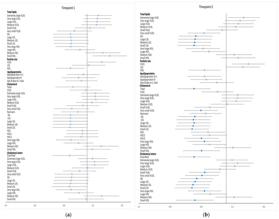 Differences in total lipids in all lipoprotein subclasses, particle size, apolipoproteins, free cholesterol and cholesteryl esters between high-risk women who developed GDM and those who did not develop GDM at timepoints 1 (a) and timepoint 2 (b). Data points show the SD difference at baseline (timepoint 1) and at the time of OGTT (timepoint 2). Positive associations with GDM are shown to the right, negative associations are shown to the left. Closed blue circles represent FDR-corrected p values of <0.05.