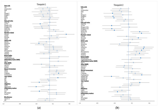 Differences in fatty acids, glycolysis-related metabolites, amino acids, ketone bodies and inflammatory and other markers between high-risk women who developed GDM and those who did not develop GDM at timepoints 1 (a) and timepoint 2 (b). Data points show the SD difference at baseline (timepoint 1) and at the time of OGTT (timepoint 2). Positive associations with GDM are shown to the right, negative associations are shown to the left. Closed blue circles represent FDR-corrected p values of <0.05. DHA, docosahexaenoic acid, 22:6; LA, linoleic acid, 18:2; MUFA monounsaturated fatty acids, 16:1, 18:1; PUFA polyunsaturated fatty acids; SFA Saturated fatty acids; TFA, total fatty acid.
