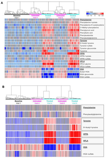 Heatmaps of urine (A) and serum (B) metabolite abundances across patient groups and sampling time points. Columns and rows represent individual samples and metabolites, respectively. Red and blue shading indicates high and low abundance, respectively. Hierarchical clustering analysis shows the sub-clustering of patients within time points for nitisinone-treated and untreated patients based on combined metabolite abundance. Figures produced using Mass Profiler Professional (build 15.1).