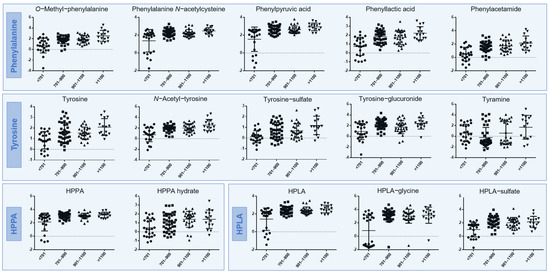 The mean raw peak areas of metabolites at each visit provide an indication of relative abundance in urine (Table S1) and serum (Table S2). It is notable that some of the biotransformation products have equal or increased abundance compared with their respective precursor metabolite (phenylalanine, tyrosine, HPPA, HPLA and HGA). Urine N-Acetyl-tyrosine and phenylacetylglutamine, for example, had greater mean raw abundance than their parent precursors at all time points except visit 4 in untreated patients for N-acetyl-tyrosine. In untreated patients, there was generally little difference between the abundance ranking order of metabolites across visits. In treated patients, there was a clear change in the abundance rankings of metabolites at visits 4 and 6 on nitisinone compared with baseline.
