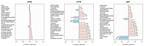 Data from Pearson correlations between urine metabolite abundance and corresponding serum biochemical concentrations of phenylalanine (sPHE), tyrosine (sTYR) and nitisinone (sNIT). Pink and blue bars represent positive and negative correlations, respectively. Data are from samples from patients on nitisinone treatment only; visits 4 and 6 combined. Figures produced using MetaboAnalyst (version 5.0) [29]. * p < 0.05, ** p < 0.01, *** p < 0.001, **** p < 0.0001.