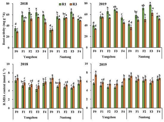 | ANOVA | R-NR (U g−1 FW) | R-GOGAT (U g−1 FW) | R-GS (U g−1 FW) | Root Activity (mg g−1 h) | R-MDA (nmol L−1) | R-SOD (U g−1 FW) | R-POD (U g−1 FW) | R-CAT (U g−1 FW) | |