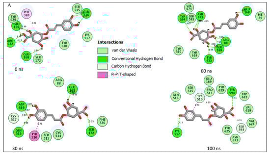 Furthermore, the type and number of interactions formed as a result of the binding between the ligand and the amino acid residues of the target protein are crucial in determining the extent of the resulting affinity [35]. In this study, 14 interactions comprising two conventional H-bond (Lys517 and Tyr594), 10 van der Waal forces (Tyr625, Asn673, Val674, Val619, Trp622, Tyr629, Pro513, Glu169, Ser515, Gln516) and two carbon-H bonds (Ser593, Tyr510) were formed with the complexation of chlorogenic acid and DPP-IV (Figure 2A), which is in sharp contrast to the nine interactions [two conventional H-bonds (Arg632 and Glu169), six van der Waal forces (Ser172, Arg321, Val170, Glu168, Tyr629 and Tyr510) and one π-π stacked (Phe320)] from the ellagic–DPP-IV complex (Figure 2B) and eleven interactions [one conventional H-bond (Asn673), six vans der Waal forces (Gly704, Tyr510, Ser172, Hie89, Ser598, Arg88), one carbon-H bond (Hid703), two π-alkyl (Pro513, Trp592) and one salt bridge (Glu168)] observed for the Diprotin A–DPP-IV complex (Figure 2C). The interactions depicted by the three systems are in conformity with the results of the thermodynamics profiles except between ellagic acid and Diprotin A, where the ellagic acid–DPP-IV complex with the most negative binding energy value (which might have been contributed by the two H-bonds) depicted fewer numbers of interactions in comparison with Diprotin A with an H-bond, since it has been reported that H-bonds contribute higher energies to the complex [36]. Additionally, the lowest number of interactions depicted by few numbers of conventional H and van der Waal bonds for the Diprotin A–DPP-IV complex might be suggested as the reason for its lower binding energy score compared to chlorogenic acid–DPP-IV with higher binding energy characterised by a greater number of convention H-bond and van der Waal forces. The higher number of interactions and H-bonds witnessed in this study by chlorogenic acid over Diprotin A was in line with similar work by Tuersuntuoheti et al. [37] where chlorogenic acid isolated from Qingke barley fresh noodles had 19 interactions (nine H-bonds and 10 hydrophobic interactions with amino acids residues of DPP-IV) compared with the used standard (sitagliptin) having 15 interactions (one H-bond and 14 hydrophobic interactions). During the 100 ns simulation period, the conserved residue Tyr510 in the interaction plots of Diprotin A and chlorogenic acid with DPP-IV in each of the time frames studied is relevant to the affinity and stability observed with the two compounds towards the target (Figure 2A,C). This crucial amino acid is missing in the 30 ns and 60 ns time frames in the interaction plot of ellagic acid with DPP-IV (Figure 2C) and may have contributed to the reduced stability observed with ellagic acid compared to the other compound studied with DPP-1V.