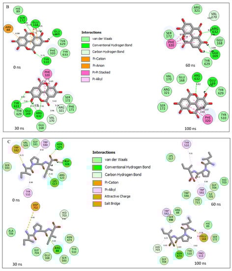 Interaction types and plots of (A) Chlorogenic acid–DPP-IV; (B) Ellagic acid–DPP-IV and (C) Diprotin A–DPP-IV at different time frame during a 100 ns simulation.
