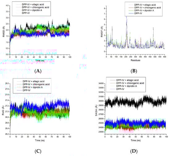 (A) Root Mean Square Deviation (RMSD), (B) Root Mean Square Fluctuations (RMSF), (C) Radius of Gyration (RoG), and (D) Solvent Accessible Surface Area (SASA) plots of comparison between Dipeptidyl peptidase-IV (DPP-IV) and chlorogenic acid, ellagic acid and Diprotin A determined over 100 ns molecular dynamics simulations.