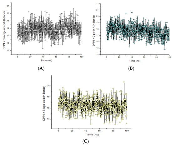 The presence of intramolecular H-bonds in a protein structure is germane in its maintenance of stability and conformation (3D) [49]. Hence, H-bond analysis in MD studies is another parameter that provides insight into the stability of the protein structures or resulting complexes formed as a result of protein–ligand binding [49,50]. H-bonds fluctuated mainly around 17–19 H-bonds in the chlorogenic acid complex (Figure 4A) and just below 17–19 H-bonds in the Diprotin A (Figure 4B) and ellagic acid (Figure 4C) complexes. All the complexes showed similar H-bond fluctuation patterns over 100 ns. However, it was noted that after 70 ns, chlorogenic acid tends to form more H-bonds with DPP-IV (in comparison to Diprotin A and ellagic acid) suggesting the reason for the higher binding energy observed with the chlorogenic acid complex, thus, enhancing the affinity of chlorogenic acid for DPP-IV. This observation agrees with the reports of Khan et al. [48] and Al-Humaydhi et al. [51] where there are consistencies in the number of H-bonds that existed between memantine–human serum albumin and galantamine–transferrin complexes post-MDS and docking findings. Above all, the H-bonding patterns of all complexes revealed that chlorogenic acid competes favorably with Diprotin A concerning the hydrogen bonding patterns over the 100 ns simulation and leads to the conclusion that chlorogenic acid could be a potential DPP-IV inhibitor.