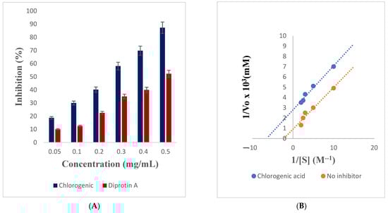 (A) Inhibitory effect of chlorogenic acid and Diprotin A on the activity of DPP-IV, (B) Uncompetitive inhibition of DPP-IV by chlorogenic acid.