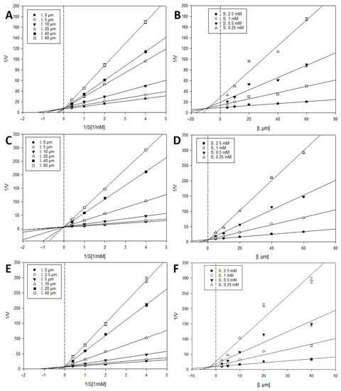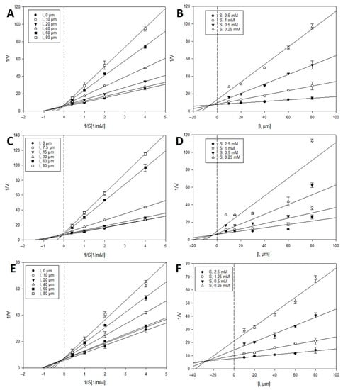 Lineweaver–Burk plots (A,C,E) and Dixon plots (B,D,F) for the β-glucuronidase inhibition of trimeric phloroglucinols 26–28, respectively.