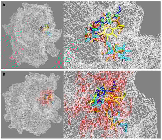 The docking results of the substrate and active compounds 13–15 and 26–28 ((A) substrate: red, compounds 13: green, 14: blue, 15: yellow, 26: pink, 27: cyan, and 28: orange) and the active site of the β-glucuronidase enzyme ((B) red site).