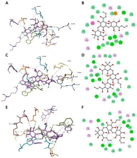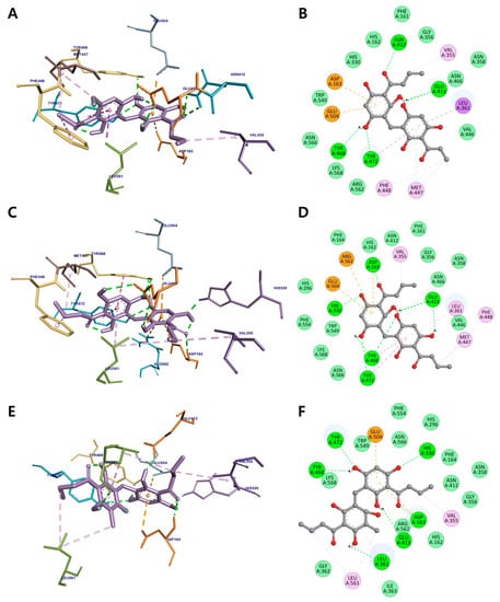 Three-dimensional molecular docking (A,C,E) and 2D interaction diagrams (B,D,F) of β-glucuronidase inhibition by dimeric phloroglucinols 13–15, respectively. Green: hydrogen bonding interactions, light green: van der Waals interactions, pink: hydrophobic interactions, and orange: electrostatic interactions with the corresponding amino acid residues of β-glucuronidase.