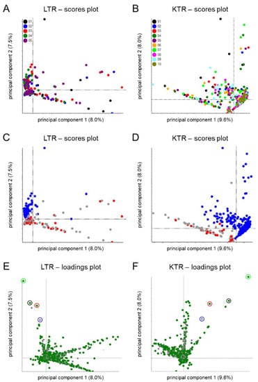 Urine samples were obtained from the TransplantLines Biobank and Cohort Study [22] for stable liver (LTR) and kidney transplant recipients (KTR). Included patients had a functional graft for at least 1 year post-transplantation, had already been transplanted before the biobank was started, and a sufficient amount of sample material had been biobanked (see Table S5). In total, 316 LTR samples were analyzed between November 18 and 22, 2021, and 570 KTR samples were analyzed between 24 November and 3 December 2021 in batches which were constructed following widely adopted recommendations [24]. Analytical performance was monitored using stable-isotope-labelled standards, as described previously [19], and a check for potential batch effects was performed using principal component analysis (PCA). The latter did not indicate pronounced batch effects (Figure 1A,B), as the first principal components showed separation based on immunosuppressive drug use for both LTR and KTR data (Figure 1C,D).