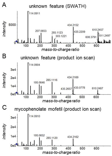 Exemplary (A) SWATH and (B) product ion scan fragment spectra of an unknown feature (m/z 610/8.4 min). This feature clusters around mycophenolate-related features in principal component analysis (see Figure 1E,F) and is observed in most but not all mycophenolate-positive samples. (C) Product ion scan fragment spectrum of mycophenolate mofetil obtained from a crushed mycophenolate mofetil tablet from the company Sandoz. The blue arrows on the y-axes indicate thresholds for presenting m/z values.