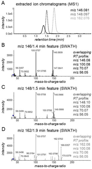Exemplary (A) MS1 extracted ion chromatograms and (B–D) SWATH fragment spectra of three possible biotransformation products of MMF’s mofetil moiety, which show spectral similarities to each other (see also Figure S4). The first feature (B) may represent the previously predicted [29] metabolite N-(2-carboxymethyl)-morpholine, the second (C) may represent the previously-predicted [29] metabolite N-(2-hydroxyethyl)-morpholine N-oxide, and the third (D) may represent N-(2-carboxymethyl)-morpholine N-oxide, which has not been described previously. The blue and white arrows on the y-axes indicate thresholds for presenting m/z values.