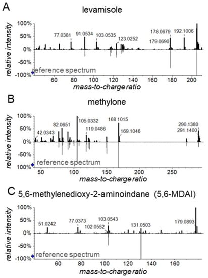 Exemplary spectral library matching results for the possible adulterants (A) levamisole, (B) methylone, and (C) 5,6-methylenedioxy-2-aminoindane (5,6-MDAI), as observed in one of the cocaine-positive samples. See Figures S6–S8 for a more detailed overview of SLM results. The blue arrows on the y-axes indicate thresholds for presenting m/z values.