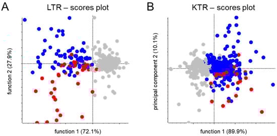 Pareto-scaled scores plots for supervised principal component analysis-discriminant analysis of MS1-level feature data of (es)omeprazole-negative and -positive stable (A) liver and (B) kidney transplant recipients. Groups were made according to the absence of (es)omeprazole (in gray) and the suspected presence of omeprazole (in blue) and esomeprazole (in red), as was based on combined clinical database- and metabolomics-derived drug use information.