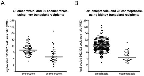 MS2 peak area ratios of the possible (es)omeprazole metabolites m/z 360 (8.3 min) and m/z 392 (8.5 min) in (A) liver and (B) kidney transplant recipients (as black dots). Median values are indicated with a gray line.