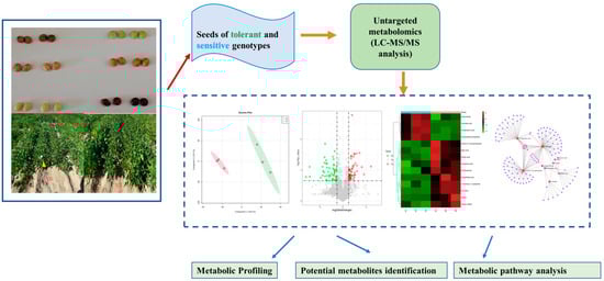 Plants have been known to undergo essential metabolic reprogramming to synthesize metabolites to adapt to stressful conditions. Several metabolic components of plants are affected by abiotic stress, and most of these are in plants’ primary and secondary metabolic pathways. These compounds allow plants to adapt and survive in unfavorable conditions [4,5]. Metabolic profile changes in response to biotic and abiotic stress have been reported [6,7]. Additionally, metabolites have often been used in crop breeding as selection biomarkers [8,9].