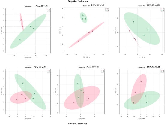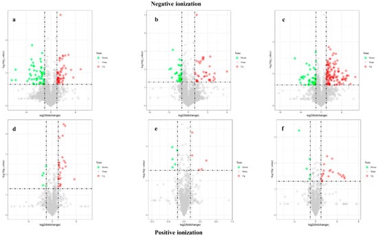 Analyze the volcano plots of genotype comparisons in both ionization modes. X > 1 and Y > 1.30 represent significant increases, while X < −1 and Y > 1.30 represent significant decreases. (a,d) A1 vs. X1, (b,e) B1 vs. Y1, (c,f) C1 vs. Z1. Red color indicates significant increases in metabolites and green indicates a significant decrease in metabolites.