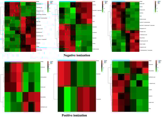 The VIP values (VIP > 1.5) were used to filter out significantly changed metabolites between the tolerant and sensitive genotypes. There were 79 metabolites in total identified in negative ionization mode and 61 metabolites in positive ionization mode. There were more significantly altered metabolites in the genotypes SB-DT2 (C1 vs. Z1) than in others. Metabolites such as linolenic acid, avicularin, homocysteine, ribosylzeatin phosphate, dibutylmalate, pyroglutamic acid, N-Acetyl-L-glutamate 5-semialdehyde, D-glucuronic acid, linolenic acid, eriodictyol, soyasaponina1, homocysteine, retinoic acid, ophthalmic acid, pyridoxine, d-fructose were detected in both ionization mode across all the genotypes (Table S5).