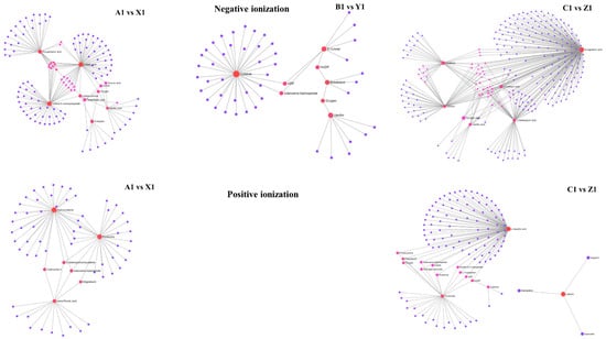 The metabolite–metabolite interaction network helps to highlight potential functional relationships between a wide set of annotated metabolites. Larger nodes with darker colors indicate the enriched metabolites are more important in the pathway. SB-DT2 (C1 vs. Z1) enriched with higher significant metabolites compared to other combinations.