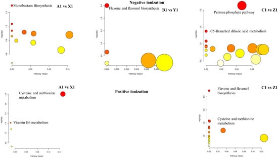 The interrelationship among metabolites accumulated in the genotypes was analyzed by generating correlation networks. The correlation network diagram was constructed based on KEGG databases and MBRole. We obtained categorical annotations for pathways, enzyme interactions, and other biological processes from the significant metabolites. Monobactam biosynthesis, sulfur metabolism, pentose phosphate pathway, citrate cycle (TCA cycle), carbon fixation in photosynthetic organisms, tryptophan metabolism, glyoxylate and dicarboxylate metabolism, pyrimidine metabolism, purine metabolism, flavone and flavonol biosynthesis, flavonoid biosynthesis, arginine biosynthesis, alanine, aspartate and glutamate metabolism, glycine, serine, and threonine metabolism were metabolic pathways found frequently in both ionization modes (Table S6). SB-DT2 (C1 vs. Z1) has more enriched metabolic pathways, whereas SB-DT3 (B1 vs. Y1) results in fewer metabolic pathways (Figure 6). We also identified significant metabolic pathways with a p ≤ 0.05. These included monobactam biosynthesis and vitamin B6 metabolism in Matterhorn, cysteine and methionine metabolism (A1 vs. X1), flavone and flavonol biosynthesis in SB-DT3 (B1 vs. Y1), and pentose phosphate pathway, c5-branched dibasic acid metabolism, flavone and flavonol biosynthesis, cysteine and methionine metabolism, flavonoid biosynthesis and monobactam biosynthesis in SB-DT2 (C1 vs. Z1) (Table 3).