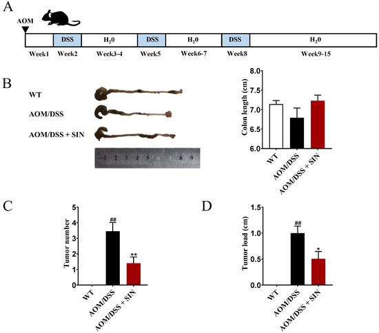 The AOM/DSS-induced mouse model is widely exploited to assess the occurrence, progression and chemopreventive agents in CAC. The procedure used for the induction of CAC model by AOM/DSS was as previously described [23]. All mice were randomly divided into the following three groups: WT group (n = 8), AOM/DSS group (n = 11) and AOM/DSS + SIN group (n = 10). On day 1, the mice in AOM/DSS group and AOM/DSS + SIN group were injected with AOM (10 mg/kg, i.p.). After 1 week, the AOM/DSS group and AOM/DSS + SIN group were allowed access to 2% DSS for 7 days. Then, they were fed with water for another 14 days. This process was cycled three times. The mice in the AOM/DSS + SIN group were orally administered with 120 mg/kg SIN orally once a day, and the mice in the WT and AOM/DSS group were given an equal volume of vehicle. All samples including serum and colon tissues were placed at −80 °C until analysis.