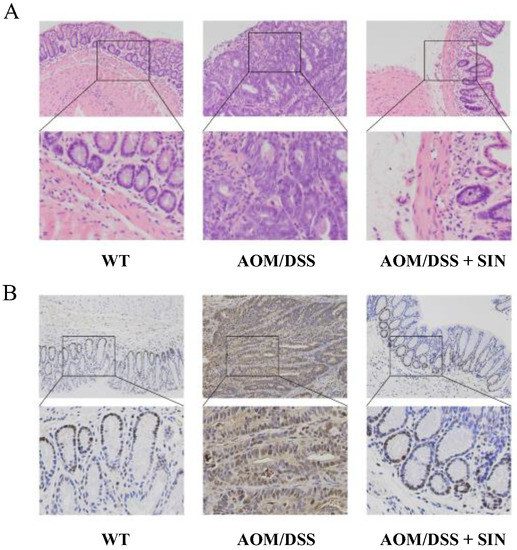 PCNA plays a pivotal role in the process of eukaryotic DNA replication, and represents an important index to evaluate the state of cell proliferation. To this end, immunohistochemical assessment was used to evaluate the effect of SIN on colonic PCNA in CAC mice. The results indicated that the number of PCNA+ cells induced by AOM/DSS in mice were significantly attenuated by SIN (Figure 3B). Overall, these data further characterized the beneficial role of SIN in CAC.