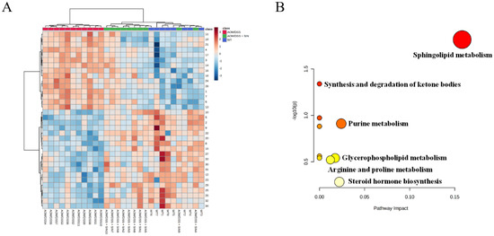 The chromatographic data were exported and further processed by multivariate statistical analysis with MetaboAnalyst 5.0 (https://www.metaboanalyst.ca/, accessed on 30 September 2022). Then, principal component analysis (PCA) was exploited to obtain an overview of samples. Partial least squares discriminant analysis (PLS-DA) was carried out to discriminate patterns among different groups. Differential metabolites were defined as those with variable importance in projection (VIP) > 1.0 and p value less than 0.05. HMDB (http://www.hmdb.ca, accessed on 24 August 2021), MassBank (http://www.massbank.jp, accessed on 24 August 2021) and LIPID MAPS (https://www.lipidmaps.org/, accessed on 24 August 2021) were used for metabolite identification according to the MS and MS/MS data.
