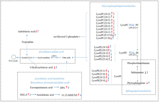 The regulation of sinomenine on lipid metabolism disorders caused by CAC. The alterations in metabolites in the AOM/DSS group compared with the WT group were labeled with a red arrow, and the changes in the AOM/DSS + SIN group compared with the AOM/DSS group were labeled with blue. The upward arrow indicates a significant increase (p < 0.05), and the downward arrow indicates a significant decrease (p < 0.05).